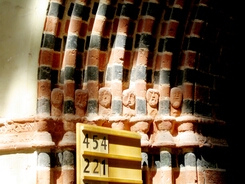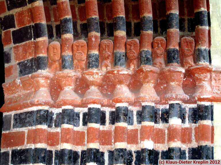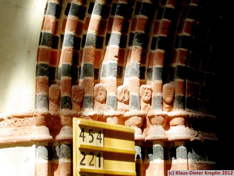 An dem einen Tag in Anklam habe ich versucht, so viel wie möglich von diesen Malereien photographisch einzufangen. Ohne Stativ oder Benutzung eines Blitzes war das nicht so einfach, und der strahlende Sonnenschein durch die Fenster ließ zwar einige Farben kräftig leuchten (siehe Bild 19 und 20 im Vergleich), aber die Kontraste zu den Teilen im Schatten waren nur schwer beherrschbar. Den Anfang bilden Bilder der Kirche von außen und der Maskenköpfe am Eingang (siehe auch oben).