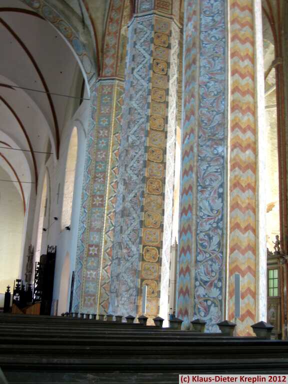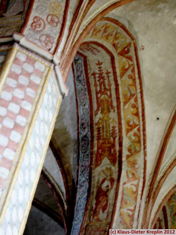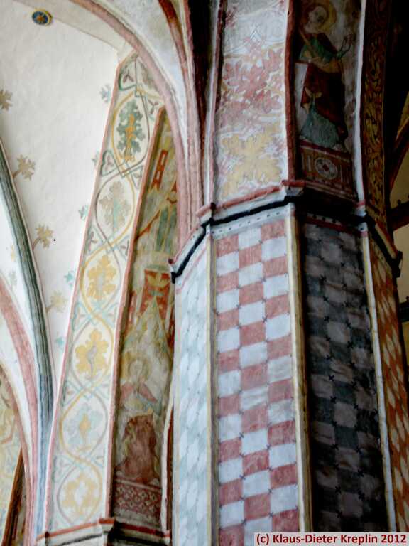 Demgegenüber tragen die figürlichen Gestalten unverkennbar den Stilcharakter des ausgehenden 14. Jahrhunderts in Norddeutschland, Die lebendige und aufgelockerte Biegsamkeit der Gestalten, die graziöse und schwungvolle Zeichnung der Umrißlinien und der lasierende Farbauftrag fügen das Ganze zu einem Stimmungsakkord von unvergleichlicher Schönheit zusammen. Außer den Figuren an den Arkadenbogen weisen noch, einige Pfeiler an ihren unteren Westseiten in etwa 2 bis 3 Meter Höhe figurenreiche Kreuzigungen auf, die offenbar früher die Bedeuuing eines Altarbildes für Nebenaltäre an dieser Stelle gehabt haben.